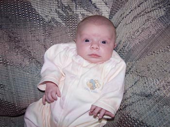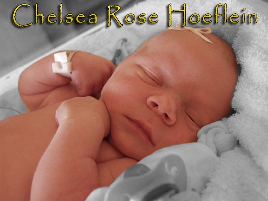 Chelsea Rose Hoeflein was born on October 15th at 1:24 in the afternoon. She weighed 7lbs 1 ounce and was 19 inches long. Tracy's labor was induced a few days before her due date to make sure that the baby was not too large, Cody was 9lbs 1 ounce and Emily was 8 lbs ounces. Baby's are supposed to get bigger the more you have so we were nervous but, our fears were layed to rest. So far chelsea sleeps a pretty consistant 4 hours stretches which is just like our emily did at that age. Emily went on to sleep a full 12 hours a night at just 3 months old, cody on the other hand was a hand full. He woke up several times at night and was hard to get back to sleep.
